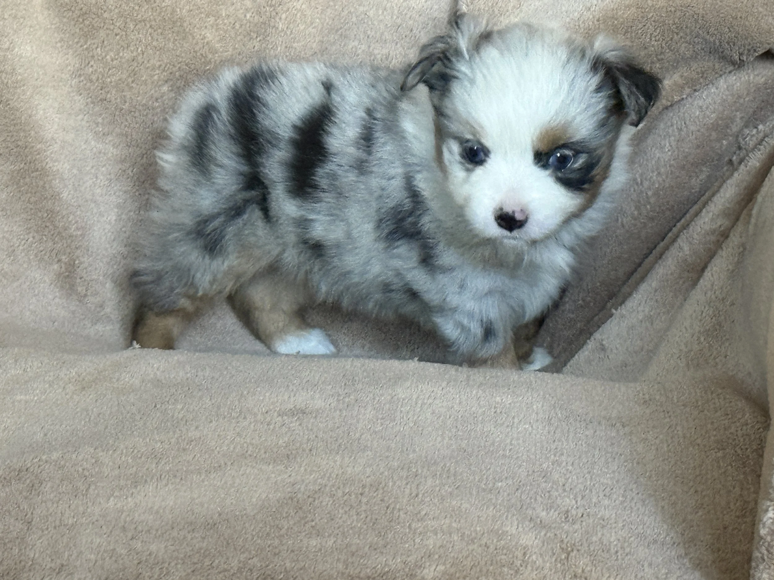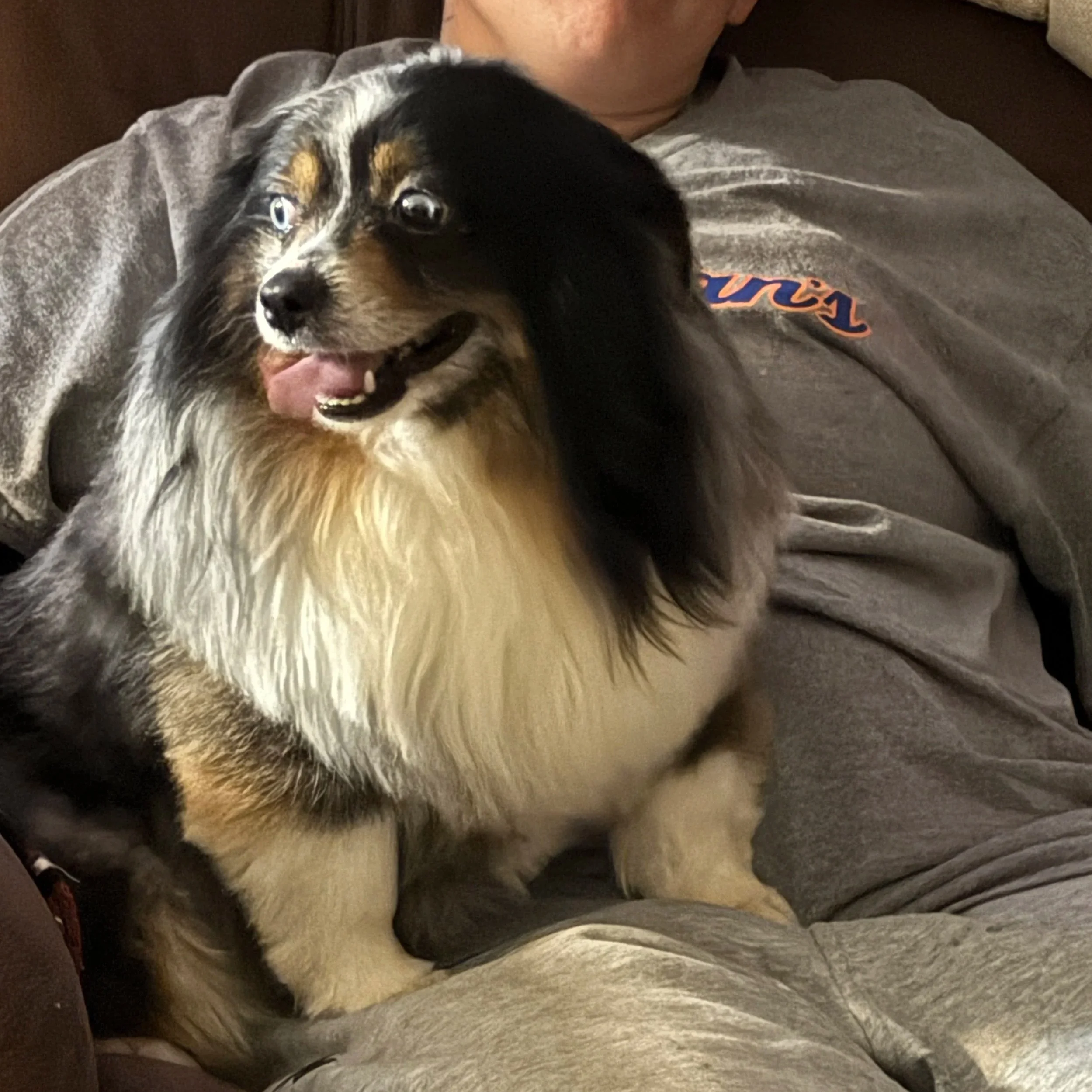 “Charlie Pride” Fancy blue Merle male. He would make a great one on one lap dog. He is on the heavy side of 20-25 pounds. 12-13 inches tall. He is good for the groomer. Loves people.