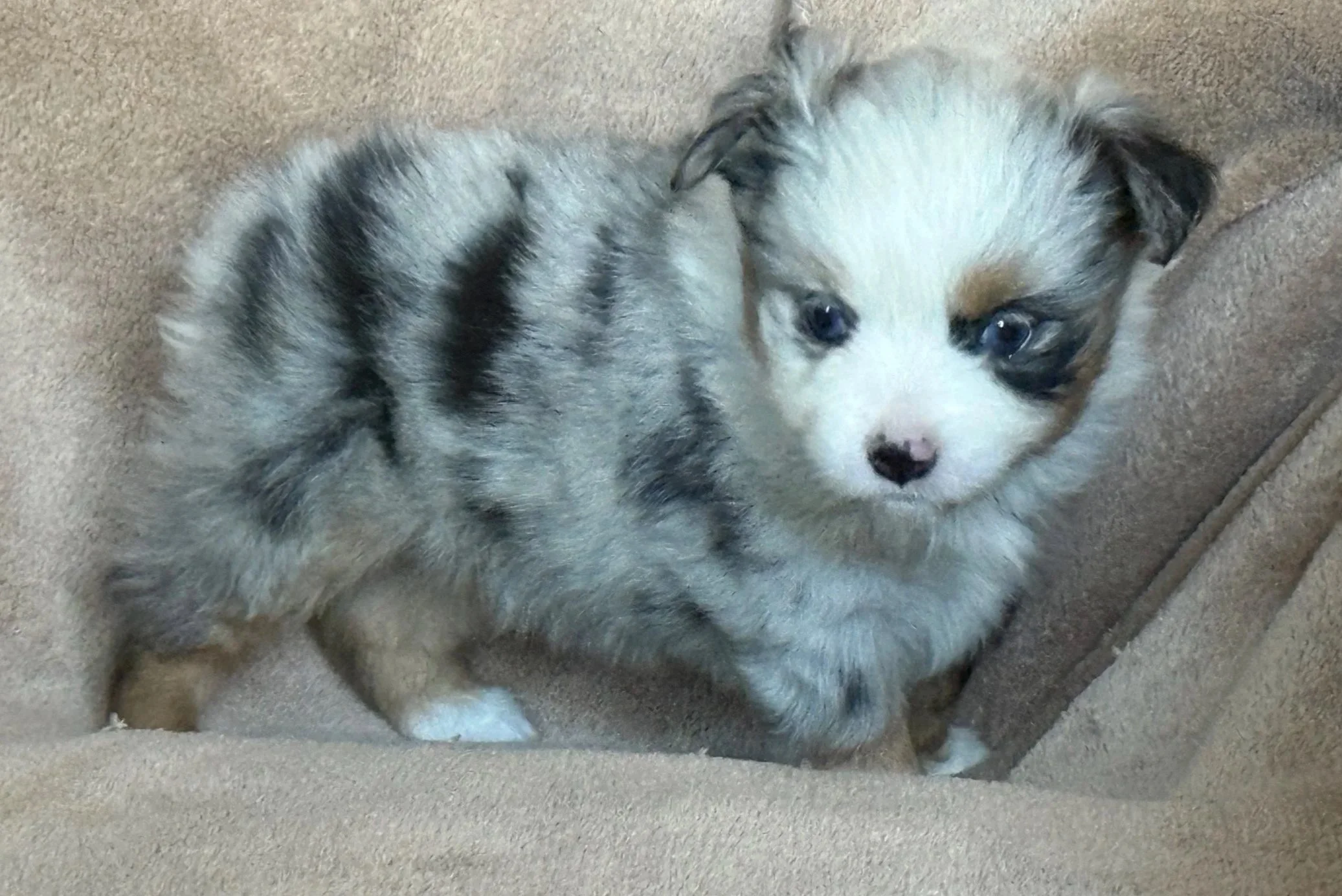 “KOON” Tiny blue Merle male, fancy black and coper markings estimated 8-10 pounds, 10 inches tall. He is a cutie & a head turner with his personality.