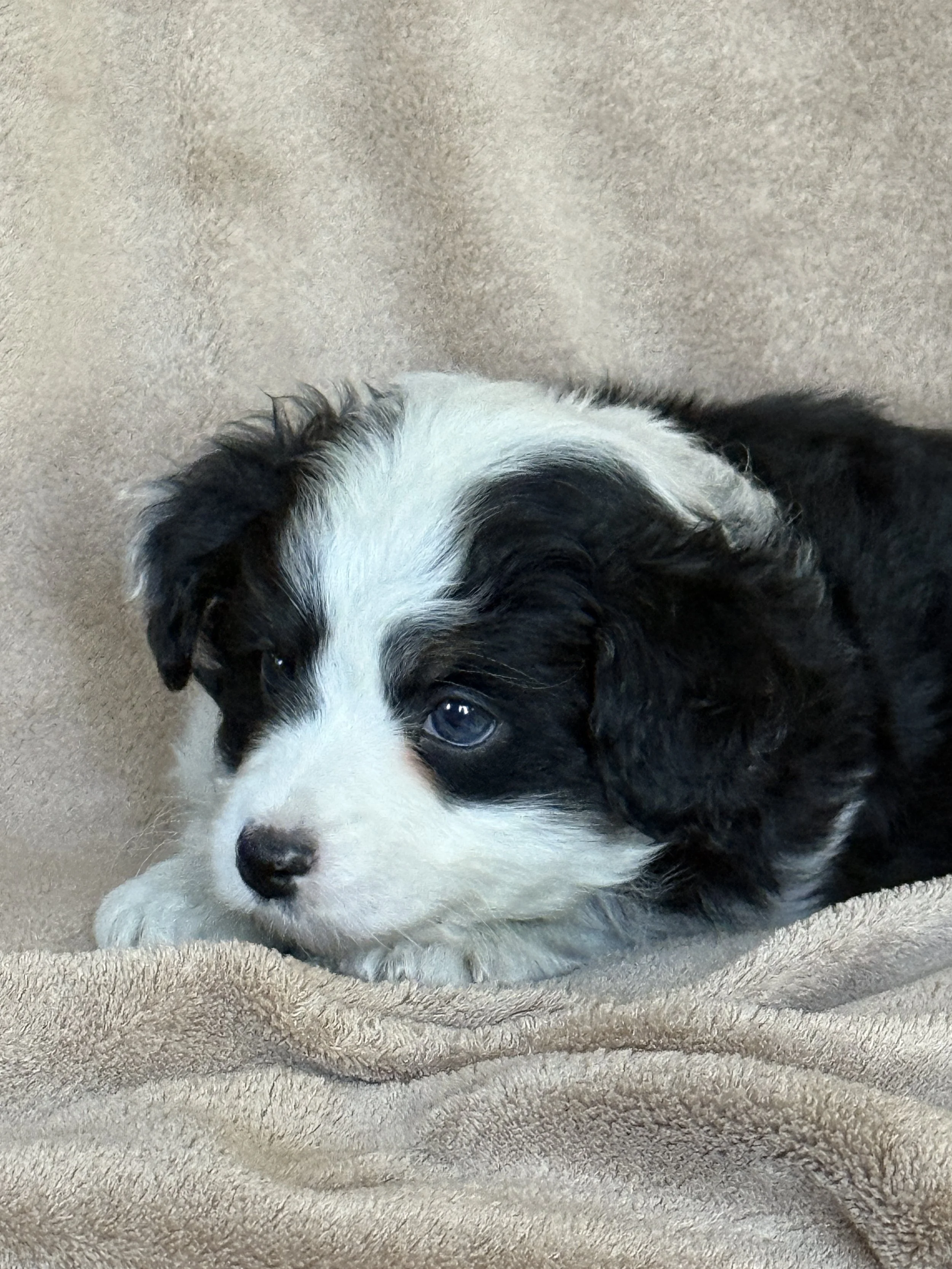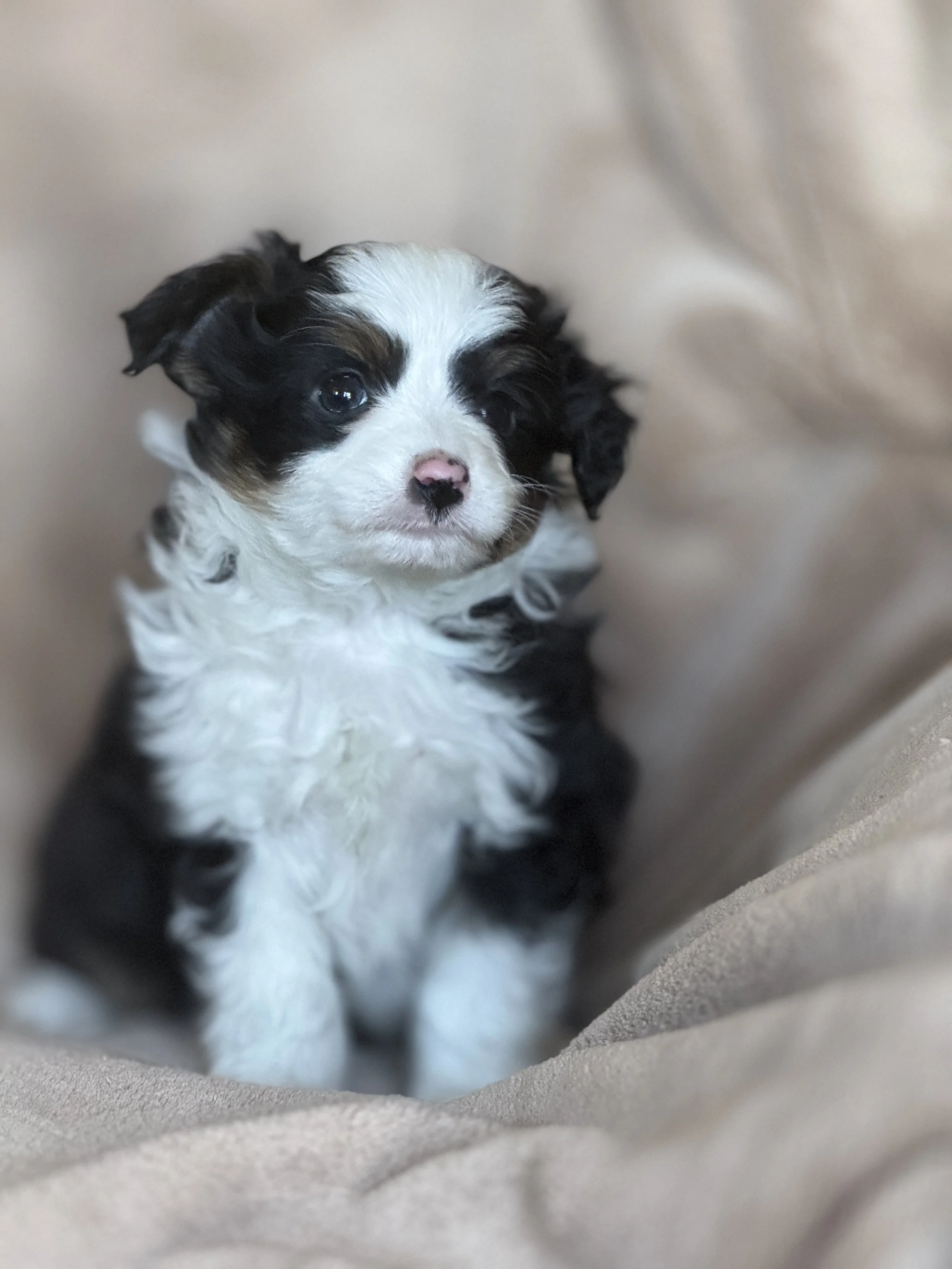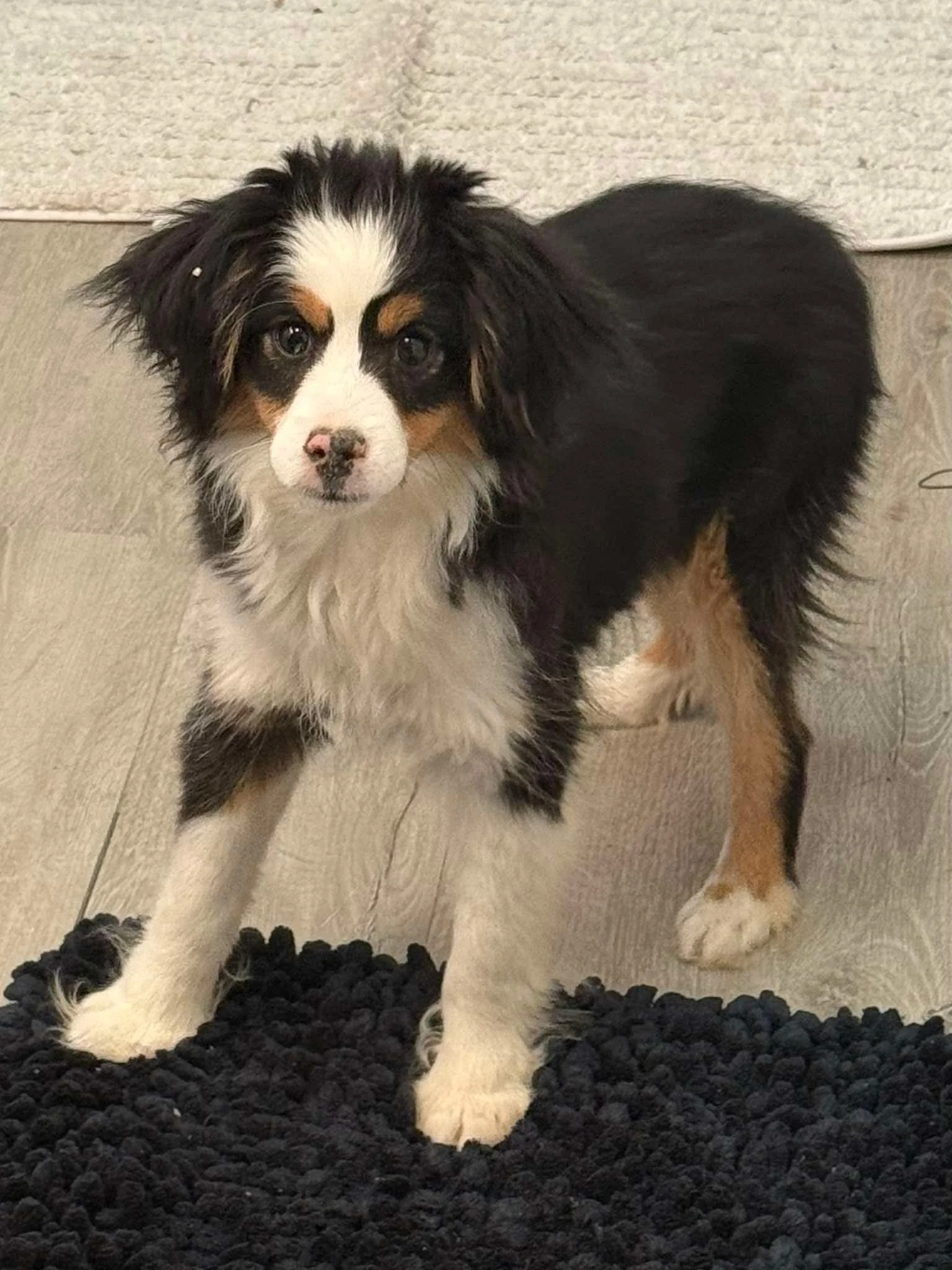 Smaller Toy Black Tri female, beautiful white chest, DOB 7-31-2025, estimated under 12 pounds. SHe is staying on the smaller side of the scale. SHe is Ready for her new home. She is a very loving puppy. Loves to snuggle, give kisses and be held. Started on potty pads and will crate quite.